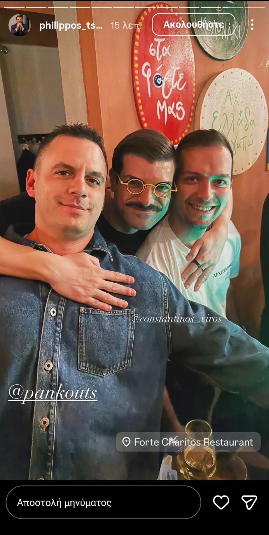 Μια κοινή έξοδο με φίλους μοιράστηκε ο Φίλιππος Τσαγκρίδης μέσω Instagram το βράδυ της Τετάρτης 25 Μαρτίου. Στο στιγμιότυπο που ανέβασε στα Stories του, ο γνωστός επιχειρηματίας ποζάρει σε χαλαρή διάθεση μαζί με τον Παναγιώτη Κουτσουμπή και ένα ακόμα φιλικό τους πρόσωπο.