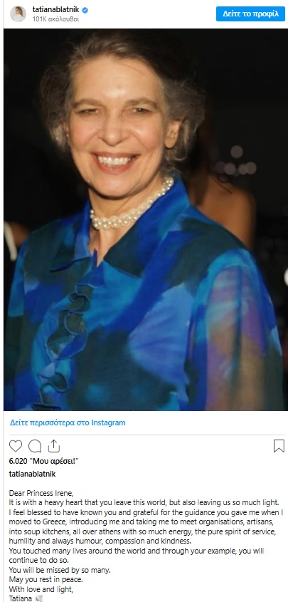 Τη βαθιά της θλίψη για τον θάνατο της πριγκίπισσας Ειρήνης εξέφρασε η Τατιάνα Μπλάτνικ με ανάρτησή της στο Instagram το απόγευμα της Δευτέρας 19 Ιανουαρίου. Η πρώην σύζυγος του Νικόλαου αποχαιρέτησε την πριγκίπισσα με λόγια αγάπης, κάνοντας ιδιαίτερη αναφορά στην πολύτιμη στήριξη που της πρόσφερε η Ειρήνη κατά τα πρώτα της βήματα στην Ελλάδα, υπογραμμίζοντας το σπάνιο ήθος και το πλούσιο ανθρωπιστικό της έργο.